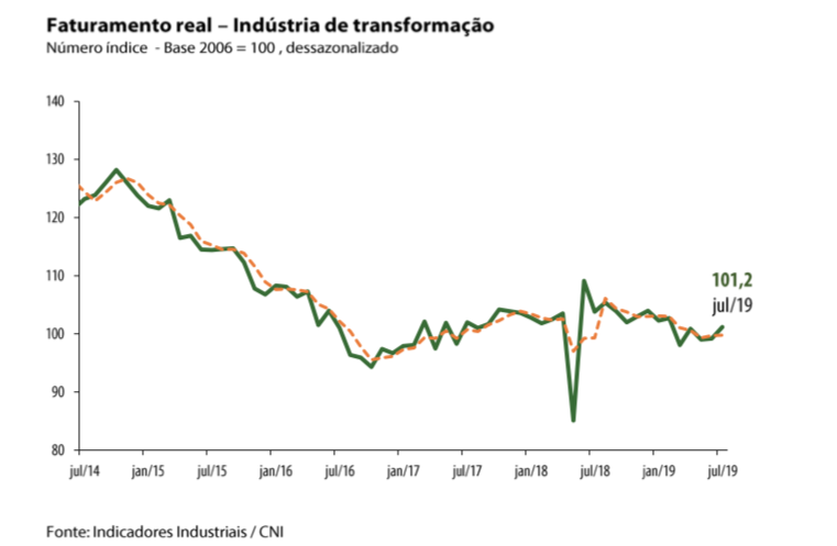 - O faturamento real da indústria voltou a crescer em julho.Após registrar alta de 0,2% em junho, o faturamento mostrou novo crescimento, de 2,0% em julho, considerando a série dessazonalizada.