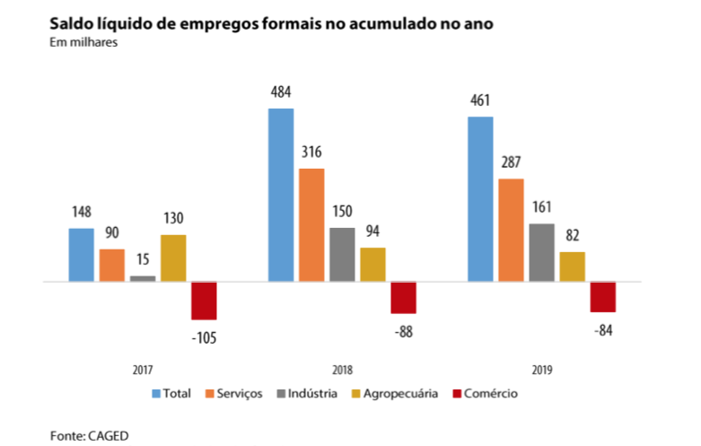 - O brasil registrou saldo líquido positivo de 43,8 mil empregos com carteira assinada em julho de 2019.