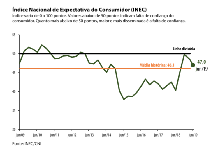- O INEC recuou de 48,4 pontos em abril de 2019 para 47,0 pontos em junho. A queda é a segunda consecutiva, que afastou o índice da linha divisória de 50 pontos, mostrando maior falta de confiança do consumidor.