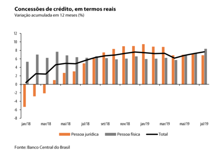 - As concessões de créditos cresceram 7,7%, em termos reais, na comparação do acumulado em 12 meses encerrados em julho de 2019 com igual período de 2018.