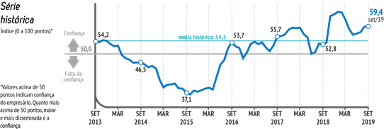 O Índice de Confiança do Empresário Industrial (ICEI) manteve-se inalterado na passagem de agosto para setembro, em 59,4 pontos. Essa estabilidade interrompe uma sequência de três meses consecutivos de alta. Não obstante, a confiança do empresário segue elevada: o ICEI segue 4,8 pontos acima de sua média histórica e 6,6 pontos acima do registrado em setembro de 2018.