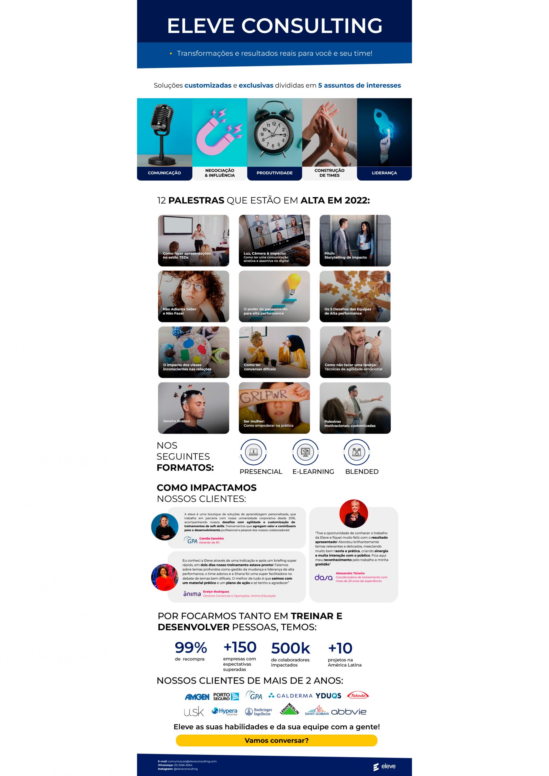 Atuamos em 5 transversais: Comunicação, Negociação, Liderança, Construção de Times e Produtividade. Com um índice de recompra de 99%, construímos cases de sucesso desde 2016 em empresas como: Novartis, Sanofi, Dasa, VLI, Locaweb, Nestlé, Magalu.