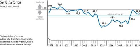O INEC (Índice Nacional de Expectativa do Consumidor) passou de 47,0 pontos em junho de 2019 para 47,3 pontos em setembro. O crescimento de 0,3 ponto não representa mudança significativa da confiança do consumidor no período, mas interrompe sequência de duas quedas consecutivas. Assim, o índice parou de se afastar da linha divisória de 50 pontos, o que mostraria maior falta de confiança do consumidor.