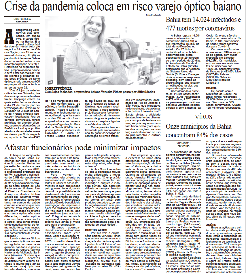 O baque no varejo óptico não é só na Bahia. Se estende por todo o Brasil e é muito grande. Muitas lojas estão fechando e a perda é geral. Agora, em 2020, o crescimento projetado era de 7%, seguindo a estimativa de 2,5% de crescimento da economia – PIB. e o Nordeste segundo maior mercado do setor, depois de São Paulo era só otimismo. Atual Diretora Presidente da Abióptica, Ambra Nobre Sinkoc diz: “Estamos vivendo um momento complexo tanto no campo da saúde como na economia que certamente trará impactos negativos em todos os setores e no setor óptico não será diferente, o setor óptico como um todo, e isso inclui o varejo, está sendo impactando negativamente, de forma muito forte, mas menos que outros setores devido a sua característica de essencialidade”.