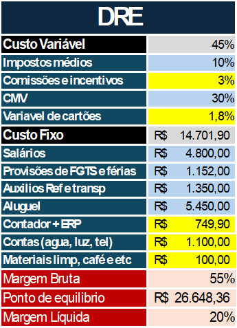 - Ponto de Equilíbrio: Com o DRE em mãos, você consegue calcular o ponto de equilíbrio; quanto precisa vender para cobrir os custos e, a partir daí, começar a gerar lucro. Esse indicador te ajuda a entender o mínimo necessário para manter o negócio funcionando — e, mais importante, te mostra o potencial de reinvestir e expandir.