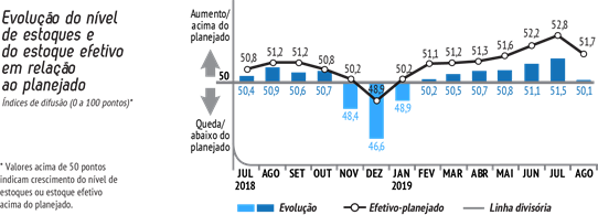 Os dados da Sondagem Industrial mostram que o nível de estoques se manteve estável em agosto. Isso representou um ajuste, ainda que parcial, dos estoques em direção ao nível planejado. Esse resultado sugere que futuros aumentos da demanda, quando acontecerem, poderão gerar maior estímulo à produção.