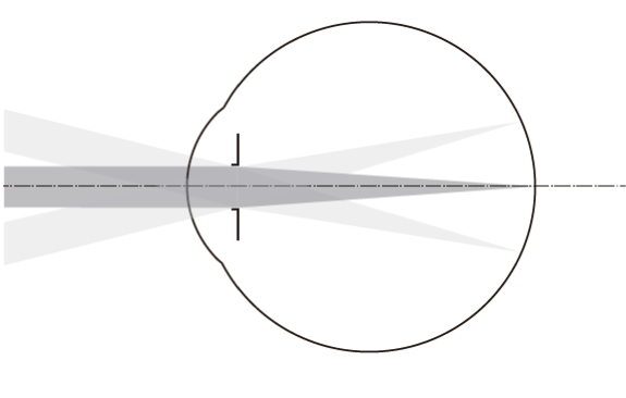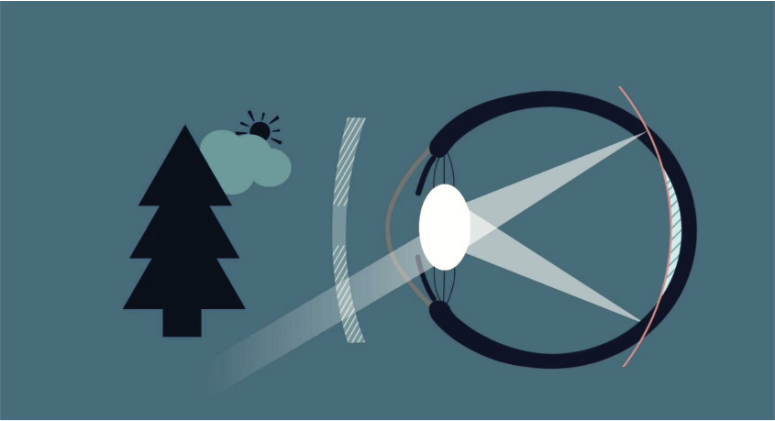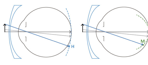 É importante diferenciar a correção da miopia e o controle da miopia. Embora as lentes de óculos de visão simples corrijam efetivamente o erro de refração do olho, elas não fornecem nenhum benefício no tratamento da progressão da miopia. Por sua característica, acabam até por influenciar de forma negativa ao gerar uma área de desfoque hipermetrópico na periferia da retina, conforme o desenho a seguir.