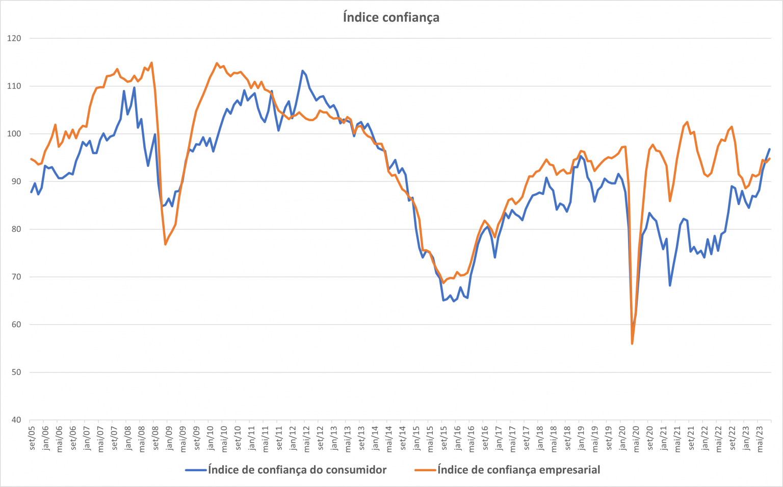 A confiança dos consumidores atingiu seu nível mais alto desde janeiro de 2019, sinalizando melhorias no varejo e consumo, mas tem um comportamento distinto da confiança empresarial, que tende a declinar, impactando investimentos, geração de emprego e renda.