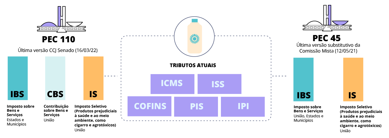 Os cinco tributos atuais sobre o consumo – IPI, PIS, Cofins, ICMS e ISS – são substituídos por um ou dois impostos sobre consumo (IBS e CBS) e por um Imposto Seletivo (IS).